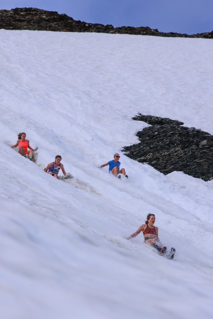 I put a good effort in on the climb and continued to slowly pass women one by one. When I reached the top, I trusted my butt sliding practice would pay off and threw myself into the luge. I was sandwiched between two racers, which oddly made me feel comforted. I popped up onto the shale without issues. My inner baby penguin felt proud.
